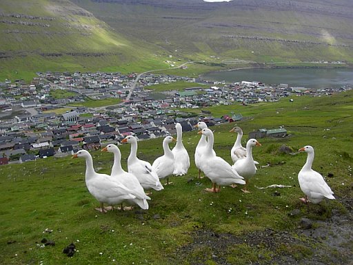 Not much to be done, get up, pack and catch the bus at 9h15 to Klaksvik. Immediately booked into the hostel and put up the tent. For the afternoon we had to climb the 413m hill Klakkus. The view, as from all the mountaintops of the Faroes, was stunning. The pictures of the geese of Klaksvik was taken about half way up.