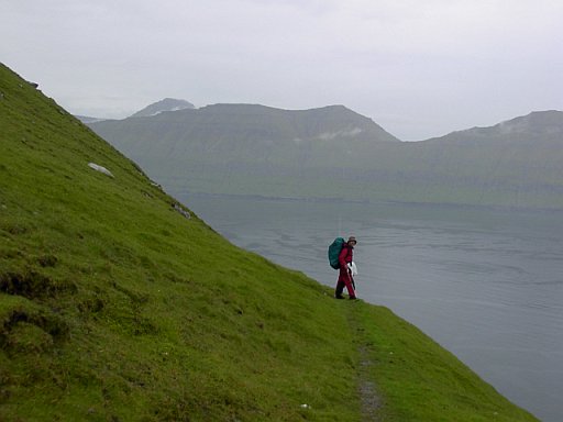 Yes, it stayed dry until the morning when we wanted to start hiking. We remained in a bit longer and only by 9h30 we got going. The drizzle soon stopped and we were on this proper path to Elduvik. Sliding along and down the mountain was a pleasure. Elduvik is a small coastal village, very concentrated. I don't know why? It looks more like a medieval town, narrow gaps between the houses, no room for a car. Here we saw a sign saying 'coffee & cake'. That was just what we wanted. The lady of the house made us very welcome. In fact it wasn't a coffee shop or anything like that, just a house with us sitting in the lounge.